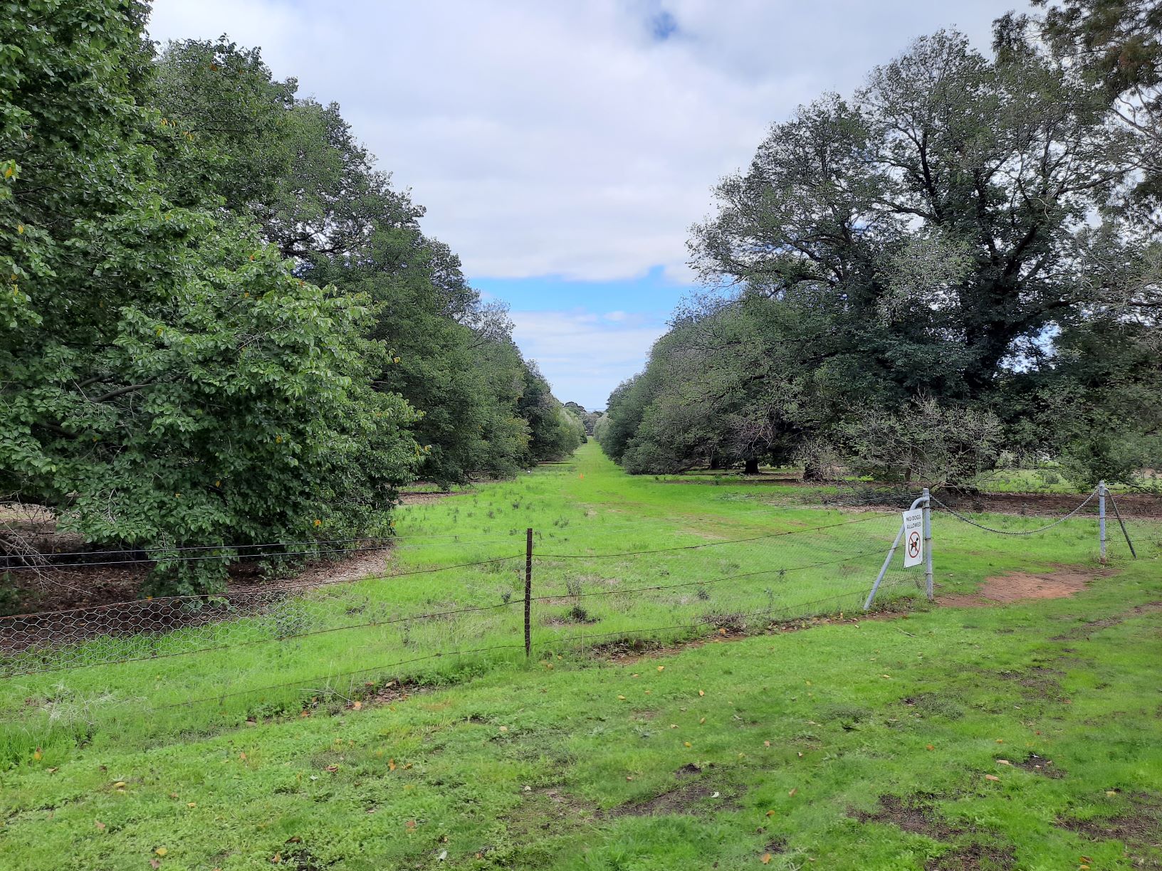 Walking east along Walter Young Drive toward Urrbrae House there are a number of Eucalyptus cladocalyx, Sugar Gums which are over 32 metres high. Followed by a collection of Corymbia citriodra Lemon-scented Gums with their smooth white to pink bark, white flowers and goblet shaped fruit. The local wildlife residents may be seen. The rainbow lorikeets and magpies and other birds can been seen on most days and sometimes one can see a koala walking along the fence line and or climbing and sleeping in the trees.