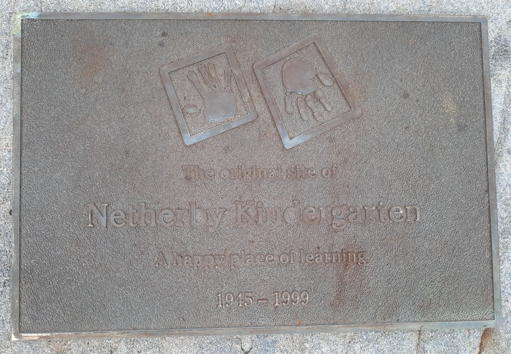 Netherby Kindergarten Arboretum sign: "The original site of Netherby Kindergarten A happy place of learning 1945 – 1999", Arboretum's south west corner in Claremont Avenue.
